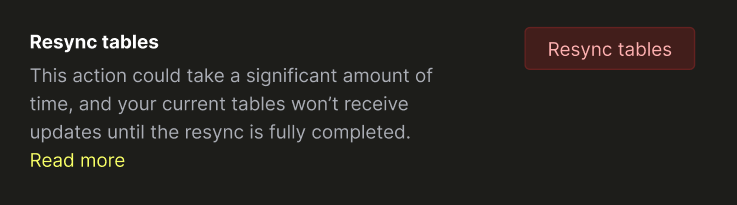 1. Вам может потребоваться внести существенные изменения в схему исходных таблиц, из-за которых существующий ClickPipe перестанет работать и его потребуется перезапустить. После внесения изменений можно просто нажать Повторная синхронизация.